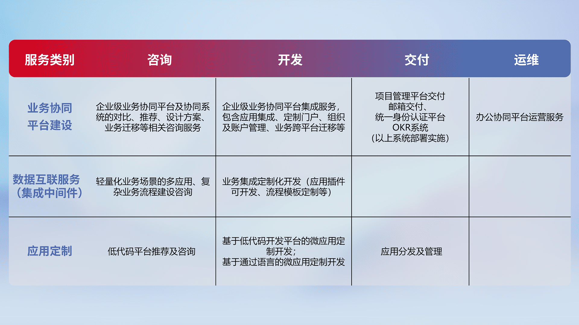 针对钉钉、、、企微、、、、IDaas等平台级产品提供产品的规划、、方案、、交付、、、、定制化开发等服务,,,实现如统一协同办公、、智能客户服务、、混合会议管理、、智能数据查询、、、等业务场景,,,,实现数字化转型。。。